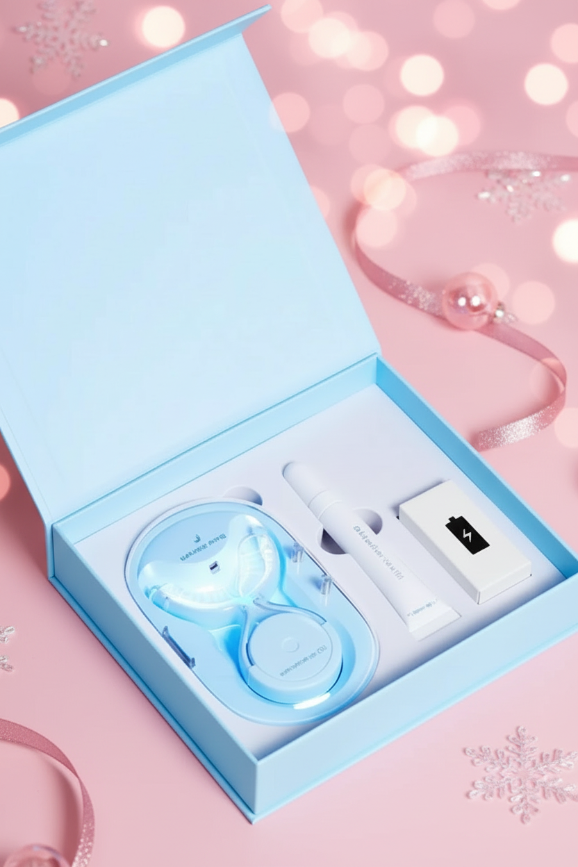 Our Holiday Pro Whitening Kit delivers professional-level results at home using advanced LED technology and gentle, enamel-safe whitening gel.