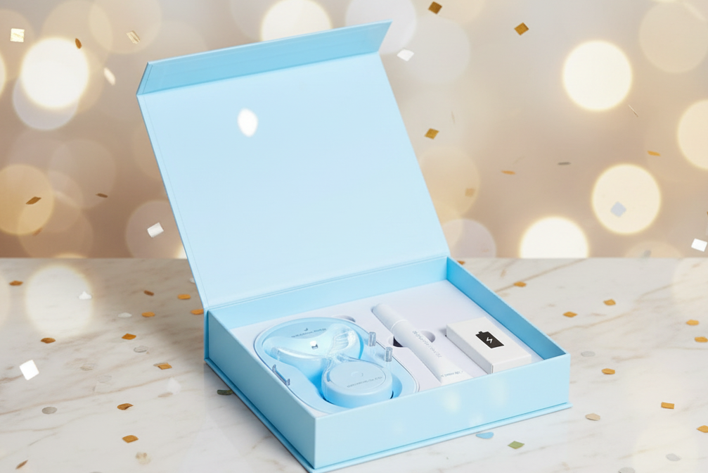 Our Holiday Pro Whitening Kit delivers professional-level results at home using advanced LED technology and gentle, enamel-safe whitening gel.